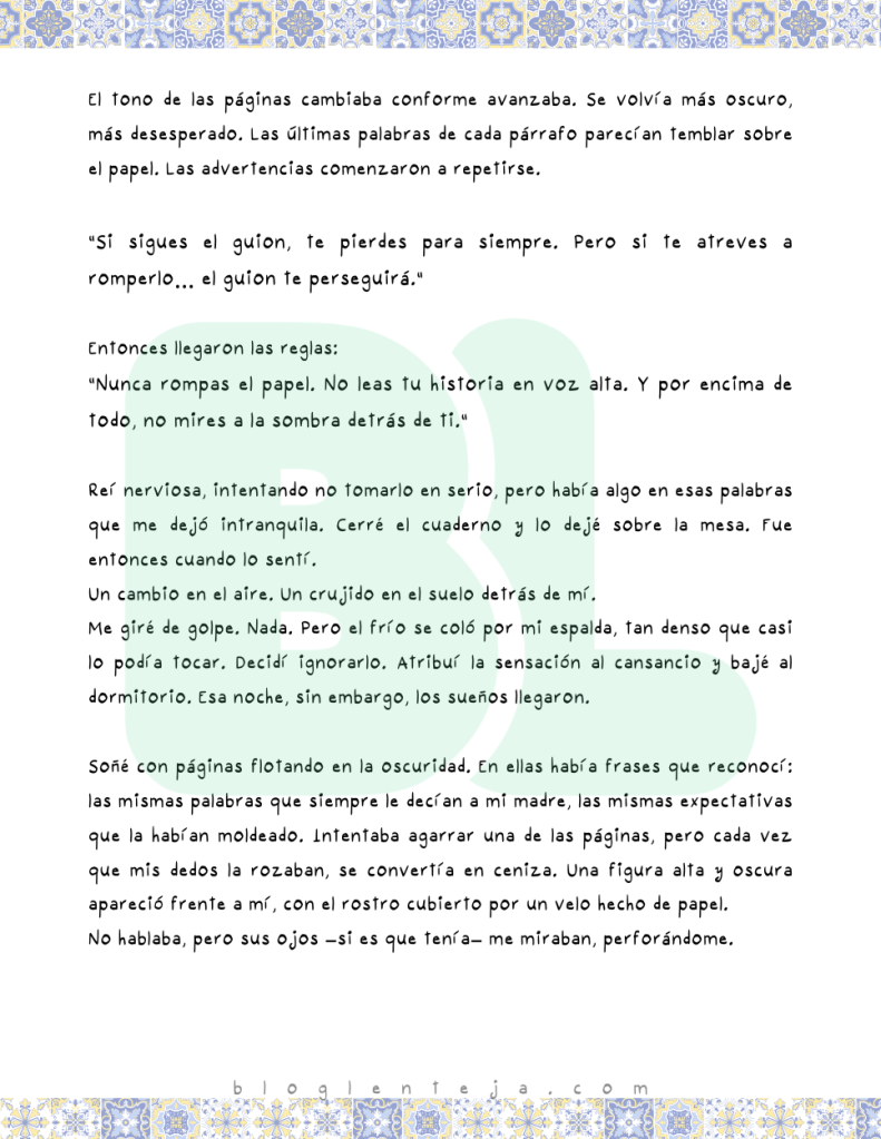A medida que lo lee, extrañas presencias comienzan a rodearla y sombras del pasado la persiguen. Las reglas del cuaderno son claras. Nunca rompas las páginas. No leas en voz alta. Jamás mires a la sombra detrás de ti.